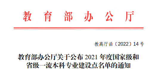近日,教育部发布《关于公布2021年度国家级和省级一流本科专业建设点名单的通知》(教高厅函〔2022〕14号),无码A片