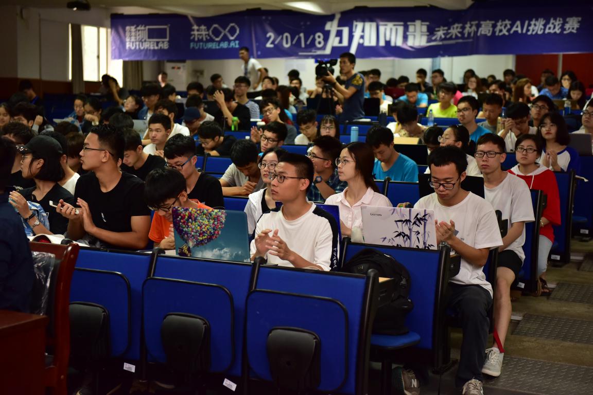 信息工程系主任蒋斌、华中科技大学计算机学院实验室主任魏巍以及“未来杯高校AI挑战赛”工程顾问赵青,现场超过350名同学来场观摩。