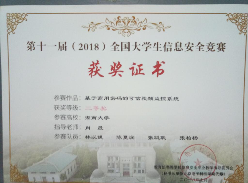 其中,作品“基于商用密码的可信视频监控系统”(参赛队员:陈夏润 张柏杨 林以钒 张聪聪)获得二等奖,作品“基于深度学习的内网智能安全日志审计系统”(参赛队员:谷璧芹 郑镐东 覃庆显 牟育霆)获得三等奖。