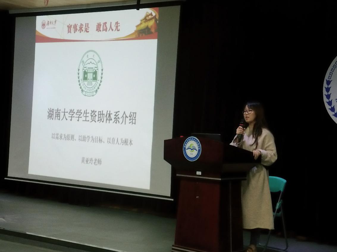 学校奖助体系以需求为原则,以助学为目标,以育人为根本。黄老师从资助工作理念、学生资助体系、资助活动三大方面为新生进行介绍。