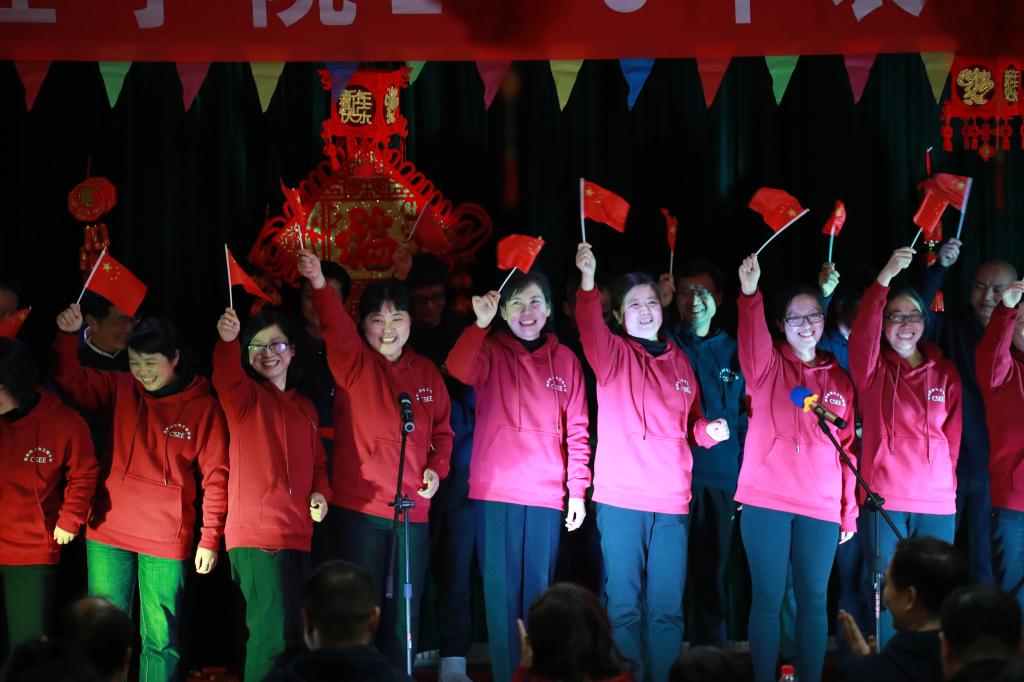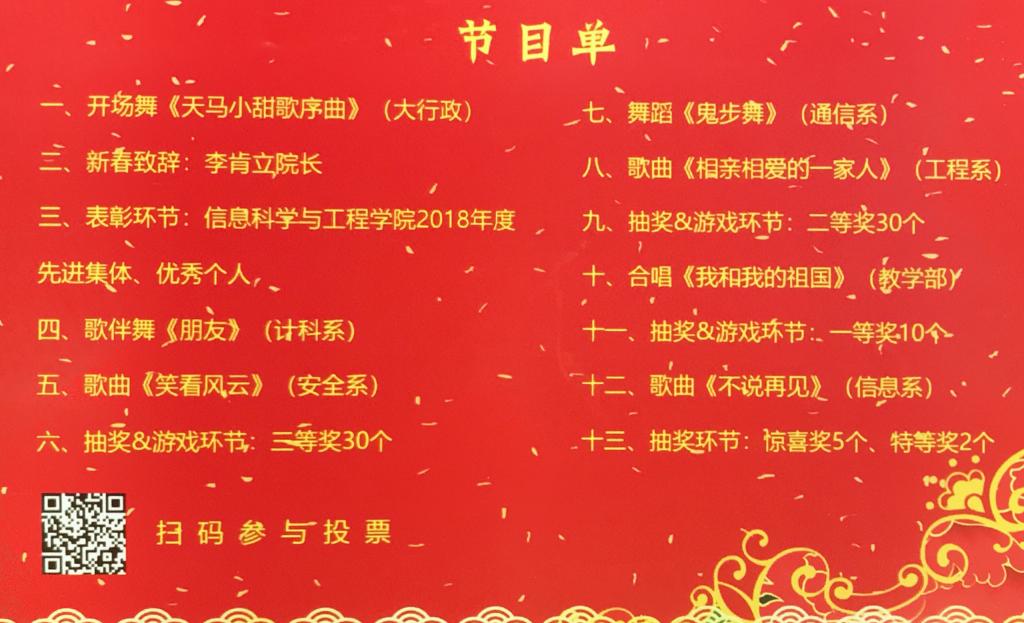 充满年味的新年彩带,五颜六色的气球,排队等待送出的小猪,优美欢快的歌曲旋律,330报告厅洋溢着节日的喜庆。大行政带来的开场舞《天马小甜歌序曲》轻松愉快,拉开了团拜会的序幕;《朋友》、《鬼步舞》、《相亲相爱的一家人》等节目把团拜会推向一个个小高潮,抽奖环节更是惊喜不断,带来了浓浓的欢乐。