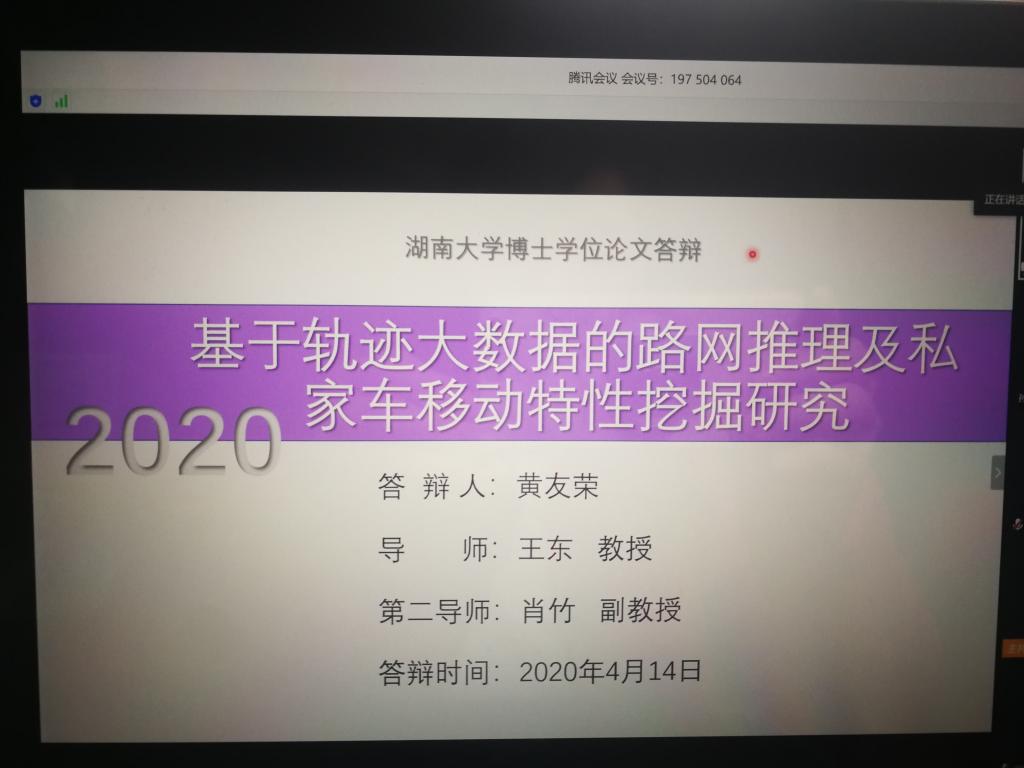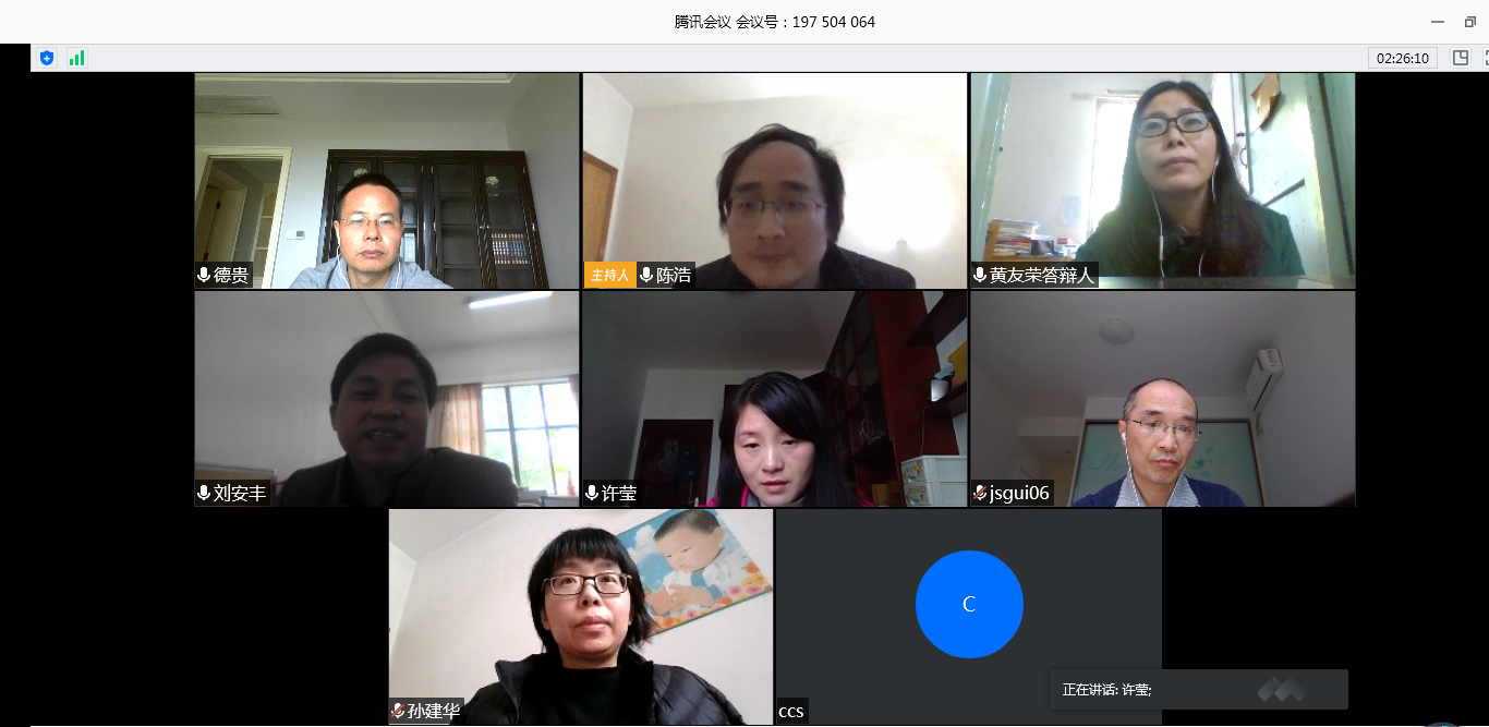 经过答辩委员线上会议讨论和问卷星无记名投票表决,一致同意通过黄友荣同学的研究成果、学位论文和答辩过程达到了博士学位的要求,并建议授予其博士学位。同屏在线答辩让异地师生如同一室,顺畅互动。多屏多终端并用,实现多位老师在线帮助学生“集体会诊”,共同督促学生积极“应诊”并通过“有效诊治”去除论文诟病,得到实质提升。本次答辩历时两个多小时,网络状态良好,声音清晰,画质优良,师生之间进行了充分有效的沟通,答辩质量和效果与线下答辩不分伯仲。