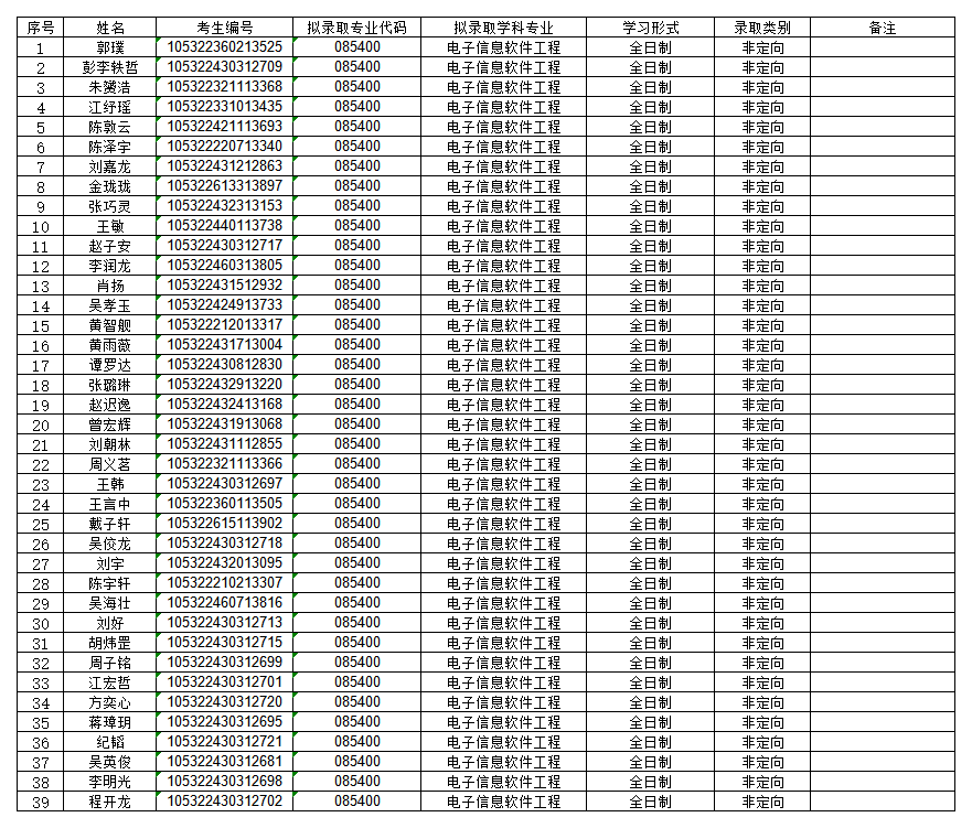 2022年硕士研究生复试录取工作实施细则》,经学院研究生招生工作领导小组审定,现将2022年全国统考硕士研究生拟录取建议名单予以公示(不含推免生)。公示期4月8日—4月21日(10个工作日)。公示期内,如对公示名单有异议,可在公示期内以书面形式向信息科学与工程学院研究生办公室进行反映,学院将及时调查、复核并回复考生。