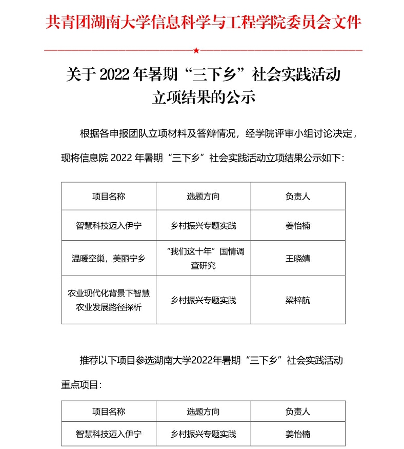 关于2022年暑期“三下乡”社会实践活动立项结果的公示