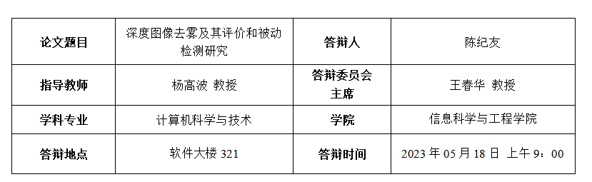 Chen J, Yang G, Xia M, et al. From depth-aware haze generation to real-world haze removal[J]. Neural Computing and Applications, 2022: 1-13.(CCF-C类期刊,第一作者)