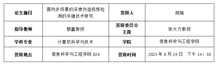 [3] 廖鑫,胡娟, 秦拯. 一种基于表征对比预测学习的深度伪造视频检测方法. 专利号:ZL202110482301.2,授权日期:2022.09.30. (授权, 本人第二发明人, 导师第一发明人)