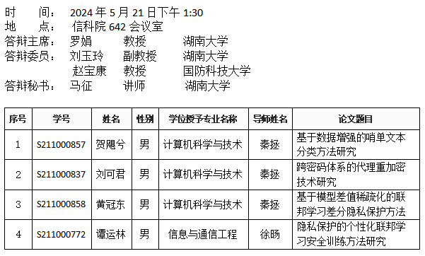 信息无码A片 (安全系)2024年5月21日硕士答辩公告