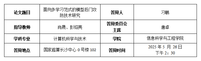 [4] Xi Peng, Tang WenJuan, Peng Shaoliang. Fighting Fire with Fire: Medical AI Models Defend Against Backdoor Attacks via Self-learning[C]//International Symposium on Bioinformatics Research and Applications. Singapore: Springer Nature Singapore, 2024: 347-358. (CCF-C会议第一作者)