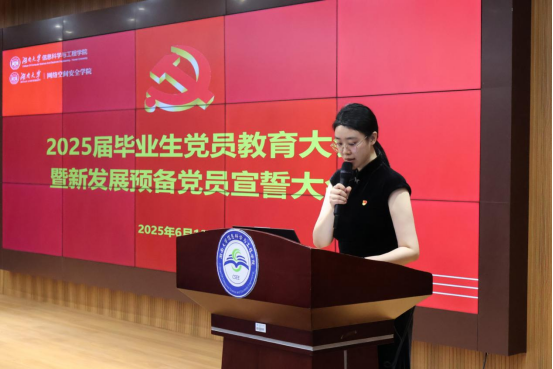 6月12日,湖南大学信息科学与工程学院、网络空间安全学院2025届毕业生党员教育大会暨新发展党员宣誓大会在院楼401报告厅举行。信科院、网安院党委书记龚完全出席并授课,党建专干罗晓岚老师主持会议。全体新发展党员、毕业生党员参加会议。